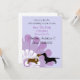 De jolies annonces de mariage à venir réalisées en bleu pervenche, avec une grande fleur stylée violette et blanche. Des graphiques d'un dachshund brun et d'un dachshund noir, avec des cœurs en lavande entre eux, ornent le bas de la carte. Tout le texte est personnalisable pour répondre à vos besoins. Mignon pour les amoureux des dachshunds et un excellent moyen d'annoncer votre mariage imminent aux invités venus de loin.