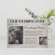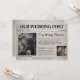 Cette invitation de mariage originale "save the date" présente un thème de vieux journal. Le fond comporte un motif délavé qui ressemble à un journal. Le titre "exciting news" est imprimé au-dessus d'un exemple d'article sur la demande en mariage et la date du mariage. Une image du couple est placée sur la gauche. La partie inférieure comporte une section supplémentaire "Weekend Update" du journal où le couple peut mettre en avant leur animal de compagnie ou quelque chose de spécial pour eux, ainsi que leur propre photo de leur animal ou une autre image.