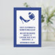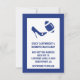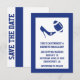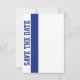 Faire annonce de mariage sur le thème du football avec un cadre de couleur bleu fédéral autour d'une zone de texte blanche. Des illustrations d'un talon haut frappant un ballon de football bleu et blanc ornent la partie supérieure de la carte, avec du texte bleu en dessous. Le dos est réalisé en blanc avec une bande verticale bleue et "Save The Date" en lettres bleues grasses écrites verticalement. Personnalisez tout le texte selon vos besoins. Grandes annonces de Save The Date pour le couple fan de football.
