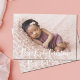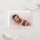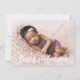 Une annonce de naissance simple et moderne avec le nom du bébé en texte blanc sur le devant et le message d'information de naissance au dos.