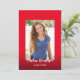 Ce modèle d'annonce de remise de diplôme minimaliste moderne rouge et blanc présente une écriture calligraphique et une photo sur le devant de la carte. Une photo supplémentaire au dos ainsi que du texte facile à modifier pour le personnaliser.