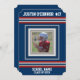 Rouge, blanc et bleu rayures de style sportif sur un fond bleu marine foncé. Cadre photo pour ajouter la photo d'équipe de votre athlète, et personnaliser avec votre nom, numéro de maillot, nom de l'école ou de l'équipe, et "promotion de" pour votre année de remise des diplômes.