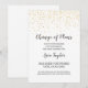 Cette élégante annonce de report de Baby Shower avec confettis dorés est parfaite pour informer les invités du report de la baby shower ou de la fête prénatale, de la douche de mariée ou d'un autre événement. Le design classe comporte de faux confettis dorés sur fond blanc avec une calligraphie simple. Personnalisez l'annonce avec le type d'événement, le nom de l'invité d'honneur et la nouvelle date.