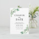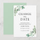En raison de récents événements ou de circonstances imprévues, vous pourriez devoir reporter votre mariage. Envoyez ces cartes à vos invités pour les informer d'un changement de date. Avec les mots "changer la date" en calligraphie, entourés d'un cadre de verdure et de fleurs blanches.