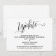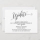 La distinction de cette suite est due à la police de caractères élaborée et tourbillonnante utilisée pour les phrases d'accent. Dans le cas où vous auriez besoin d'informer vos invités que votre mariage a été annulé, cette carte offre une option élégante. Dans ce modèle, la police de calligraphie a été utilisée pour créer un graphique représentant le mot " Mise à jour ". Utilisez les champs du modèle pour ajouter vos informations personnelles et faire de ce design le vôtre. L'arrière-plan peut être modifié selon la couleur de votre choix. N'hésitez pas à nous contacter pour toute demande spéciale ou pour une aide à la personnalisation. // 98 //