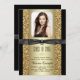 Joli noir et or parties scintillant de graduation faire-part. Cette belle faire-part de graduation en noir et or est facilement customisée avec vos photos et détails de l'événement dans le style et la couleur de police, et le libellé de votre choix. Vous pouvez également changer la couleur arrière - plan sur cet élégant faire-part de graduation noir et or.