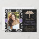 Ajoutez votre image de photo ou de favori à ces annonces et invitations florales noires et blanches élégantes et formelles d'obtention du diplôme d'école dentaire de damassé avec un caducée simple de serpent d'or et une conception imprimée de regard de ruban piquée par pourpre de lavande pour le dentiste de graduation. Customisez-le pour dire celui que vous vouliez sur l'arrière et avant de ces annonces et invitations d'obtention du diplôme de diplômé d'art dentaire. © Chrissy H. Studios, LLC d'illustration. Tous droits réservés.