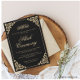 Définissez le ton de votre jour de mariage avec cette carte de cérémonie Nikah musulmane islamique noire et élégante. Un fond sombre et simple permet à chaque détail doré de briller. Dans chaque coin, de délicates volutes rococo se déploient - des feuilles courbes et des motifs de parchemin anciens qui encadrent l'invitation pour donner une sensation élégante et royale. En haut, une calligraphie arabe religieuse. En dessous, les mots "Cérémonie Nikah" sont écrits dans un script doré stylisé, guidant immédiatement vos invités au cœur de cette célébration de mariage.
