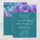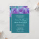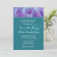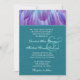 Ce design avec des pétales de fleurs de dahlia d'aqua et violet qui s'émerveillent derrière un élégant arrière - plan de lin imprimé turquoise fait une élégante invitation de mariage, et est actuellement présenté sur l'élégant papier de lin. Vous pouvez expérimenter avec différents types de papier pour obtenir juste le look que vous voulez. Un RSVP correspondant est montré ci-dessous.