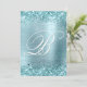 Une élégante invitation monogrammed 50e anniversaire 5x7 pour elle. Faux aqua parties scintillant turquoise avec étincelles contre un faux plan en métal brossé bleu pâle. Le blanc fantaisie avec turquoise foncé de calligraphie ombre monogramme dans le centre peut être customisé. Tous les éléments brillants et brillants de ce design girly moderne sont des graphismes numériques. Vous pouvez transférer le design de luxe monogrammé sur le devant à un petit ou moyen cadeau correspondant.
