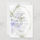 FAIRE-PART DE FIANÇAILLES INVITATION | Fleurs aquarelle et formes géométriques dorées avec feuilles d'eucalyptus, anémones lilas et violettes et fleurs d'hortensia, - un cadre ovale géométrique doré à facettes multiples orné de feuilles d'eucalyptus et de bouquets de fleurs. Le verso est d'une couleur coordonnée complémentaire. Personnalisez le texte, le style de police, la couleur et la taille. Cela fait partie d'une suite complète de papeterie de mariage avec papeterie assortie pour mariage, baby shower et autres événements.