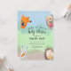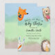 Invitations de douches pour bébés sans sexe. Illustration d'une aquarelle d'animaux boisés : renard avec bleuet dans les pattes, ours avec framboise, hérisson avec poire, lapin (lapin) avec carotte. L'arrière - plan d'aquarelle est multicolore.
