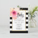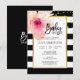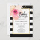 Invitation modèle tendance et moderne pour le baby shower en rayures blanches et noires. Cadre en or faux avec fleur rose aquarelle à l'angle. Tout le texte peut être modifié et modifié : police, couleur et taille. Contactez le concepteur pour d'autres variantes ou de l'aide.