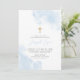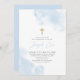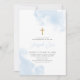 Aquarelle bleue avec fausse invitation de croix religieuse en or. Une invitation moderne et élégante au baptême ou au baptême pour la journée spéciale de votre petit garçon.