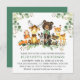 Aquarelle Bois Animaux Baby shower Invitation. Bébé Les animaux comprennent Ours avec arc vert, Cerf, Moose, Raccoon, Lapin lapin, Renard et Chouette sur les feuilles d'eucalyptus et la végétation forestière.