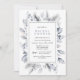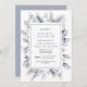 Élégantes invitations à la douche nuptiale avec cadre botanique bleu acier. Arrière - plan blanc aéré avec une couleur bleu-gris au verso. Idéal pour une douche nuptiale en hiver.