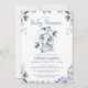 Invitation baby shower moderne avec un éléphant d'aquarelle mignon tenant un lapin farci entouré d'eucalyptus doux et aquarelle et de verdure en bleu et gris poussiéreux et le BABY SHOWER de titre en typographie de script de calligraphie. ASSISTANCE : Pour obtenir de l'aide sur la modification/la personnalisation de la conception, le changement de couleur, le transfert de la conception vers un autre produit ou si vous souhaitez coordonner des éléments, contactez le concepteur AVANT DE COMMANDER via l'onglet MESSAGE Conversation Zazzle ou par courriel à l'adresse makeitaboutyoustore@gmail.com.