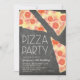Des amis Invitations à l'anniversaire de pizza de votre enfant avec ces invitations mignonnes. Le design présente les détails de votre fête entourée de tranches de pizza pepperoni colorées à l'aquarelle sur un arrière - plan rustique en tableau noir. Ajoutez les détails de votre fête à l'aide des champs de modèle fournis.