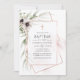 Invitation du baptême avec des fleurs d'anémones et des feuilles d'eucalyptus dans un cadre géométrique or rose.