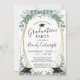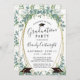 Belle invitation à la fête de graduation avec aquarelle eucalyptus et verdure accentuée de bouchons de graduation sur un cadre de parties scintillant or avec script manuscrit chic moderne. Contactez le concepteur via Zazzle Conversation ou makeitaboutyoustore@gmail.com si vous souhaitez modifier ce design, sur un autre produit ou des éléments de coordination.