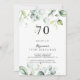 Cette invitation à la fête de 70e anniversaire d'eucalyptus vert aquarelle est parfaite pour une fête d'anniversaire rustique. Cette conception artistique présente un feuillage vert d'eucalyptus dessiné à la main, aquarelle, inspirant la beauté naturelle.