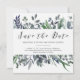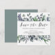 Cette carte moderne de save the date de mariage botanique présente des feuilles aquarelles dans des nuances tendance de vert, de bleu et de gris pour un look stylé à la fois minimaliste et rustique.