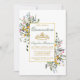 Moderne Elégant Fleur sauvage d'aquarelle Quinceanera Invitation comprend des fleurs sauvages jaunes, roses, violettes, bleues et blanches poussiéreuses, des feuilles d'eucalyptus, des feuilles verts sauge et d'autres plantes botaniques sur un cadre doré. Gold Tiara Crown. Sage Green Back.