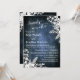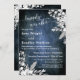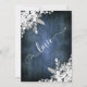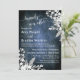 Voici une charmante invitation pour votre événement après-réception de mariage. Le fond est d'abord recouvert d'un motif graphique bleu foncé texturé et terreux qui présente un grain de bois et des lignes vintage. Les coins sont accentués par des éclaboussures de peinture aquarelle florale blanche et noire/gris. Vos détails apparaissent en blanc brillant. Pour compléter la police sans empattement utilisée pour votre texte modifiable, j'ai ajouté les mots clés "happily ever after" ainsi que les accents "and" et "love" au dos, en utilisant une jolie police de calligraphie moderne.