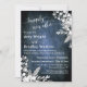 Voici une charmante invitation pour votre événement qui suit la réception de mariage. L'arrière-plan est d'abord recouvert d'un motif graphique bleu foncé texturé et terreux qui présente un grain de bois et des lignes vintage. Les coins sont accentués par des éclaboussures de peinture aquarelle florale en blanc et noir/gris. Vos détails apparaissent en blanc brillant. Pour compléter la police sans empattement utilisée pour votre texte modifiable, j'ai ajouté les mots clés "happily ever after" ainsi que les accents "and" et "love" au verso, en utilisant une jolie police de calligraphie moderne.