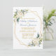 Watercolor Ivory White Floral Greenery Card comprend des roses blanches crème d'ivoire et de la verdure botanique. Cadre Géométrique Or, Script Or, Arrière Bleu Dusty.