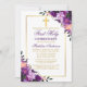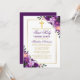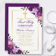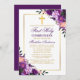 Elégante aquarelle violet Ultra Violet Floral First Holy Communion Invitation comprend des pivoines, du lilas et de la verdure. Cadre Or. Croix d'or.