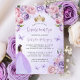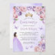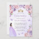 Cette jolie invitation de quinceañera comporte une bordure de violet lilas et roses roses rousses sur un arrière - plan d'aquarelle violette. Une tiara dorée, une brune en robe de princesse violette et de petits papillons violets décorent le texte. Le mot "Quinceañera" et le nom de l'invité d'honneur apparaissent dans un élégant script d'écriture violet, avec le texte restant en gris sans serif.