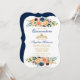 Elégante aquarelle moderne Floral and Greenery Quinceanera Invitation comprend jaune doré, pêche, fleurs et roses bleus et bordeaux, verdure botanique et écriture or. Gold Tiara Crown. Royal Blue Back.