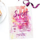 Cette invitation à 16 ans Sweet est un délicieux mélange d'élégance et d'esprit artistique. Il présente une belle aquarelle arrière - plan dans les tons violet, rose et blanc, créant une ambiance festive et vibrante. Le mot "Sweet" est affiché dans une police de caractères élégante et cursive au centre supérieur, donnant le ton d'une célébration mémorable. La couleur du texte varie entre le blanc et le violet foncé pour assurer la lisibilité contre l'arrière - plan coloré. Le design général est moderne mais élégant, captant l'attention tout en fournissant toutes les informations nécessaires. Cette invitation n'est pas seulement un appel à une fête, mais une oeuvre d'art qui promet une célébration douce et inoubliable.