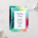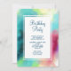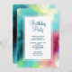 Invitation fête d'anniversaire avec un design abstrait cool et élégant. Les aquarelles se mélangent pour créer l'illusion d'une image spatiale. Vert avec des touches de violet, jaune et rouge clair se marient avec un peu de points et d'étoiles blancs. Une élégante création artistique.