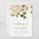 Cette élégante invitation au mariage présente des fleurs d'aquarelle tendance dans les tons rose, rose poussiéreux et taupe avec beaucoup de verdure et des accents modernes, faux or. Des éclaboussures d'aquarelle rose pâle et subtiles décorent l'arrière - plan.