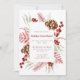 Une élégante invitation à la maison ouverte de vacances de Noël. Cette invitation à fêtes de noël présente un cadre floral de noël avec verdure, eucalyptus, baies rouges et cônes de pin. Tout le texte sur la carte peut être customisé.