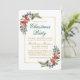 Elégante aquarelle Poinsettia Floral Green and Gold Script Christmas Party Invitation inclut de belles poinsettias rouges aquarelle, verdure botanique, feuillage d'hiver, baies sèches, roses blanches, cônes de pin et baies bleues. Cadre Or.