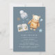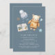 Jolies invitations à des douches pour bébé sur le thème de l'hiver avec des illustrations d'aquarelle douillette d'un ours en peluche, un livre et un casquette bébé. Couleur bleu ardoise avec police blanche. Le design neutre est idéal pour un bébé garçon ou une petite fille.
