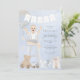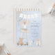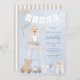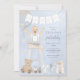 L'invitation à la fête de premier anniversaire bleu et or présente un adorable petit garçon dans un fauteuil roulant et orné d'un ballon à fleurs, de cadeaux, d'ours en peluche et d'un train de jouets. Plusieurs options sont disponibles pour la couleur des cheveux et le ton de la peau du bébé. Fun gâteau de premier anniversaire cassé sur le dos avec numéro un. Peut également être utilisé pour le deuxième anniversaire en modifiant le texte.