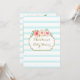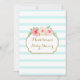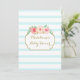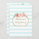 Invitations de douche bébé personnalisées avec motif bleu ciel pastel clair et rayures blanches, détails dorés et joli rose aquarelle fleurs vintages. Parfait pour un baby shower de printemps ou d'été.