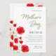 L'élégante invitation à la fête des mères présente une aquarelle rouge pavot florale, des feuilles verdoyants et de la typographie.