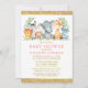 Aquarelle Safari Animaux Baby shower de verdure Carte d'invitation. Les bébés animaux comprennent l'éléphant, le singe, la girafe, le rhinocéros, le zèbre et le lion sur les feuilles de fougères. Aquarelle Botanique Verdure. Gold Text, Gold Parties scintillant. Pink Back.