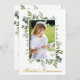 Aquarelle moderne Elégante Botanique Verdure Photo First Holy Communion Invitation inclut des feuilles d'eucalyptus et d'autres beaux feuillages. Croix d'or.