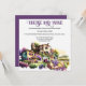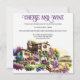 Une belle et élégante illustration de deux villas toscanes aux jolies persiennes violettes aux fenêtres sont nichées dans une vallée de vignes et de fleurs de lavendar violet et d'arbres verts. Un seul verre de vin rouge apparaît au premier plan et est entouré de grappes de raisins violets, rouges et noirs. Un délicieux plateau de fromage avec une sélection de fromages et d'huiles repose sur une planche en bois à droite du verre de vin et l'illustration est placée contre un arrière - plan blanc qui a des modèles de texte modifiables en noir et violet gras sur elle pour votre libellé personnalisé. Ce graphique est idéal pour un cocktail "fromage et vin" ou pour un anniversaire, un anniversaire, une retraite ou un événement de remise de diplômes. Il est extrêmement polyvalent et peut s'appliquer à tout événement ou événement spécial.