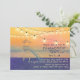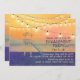 Profitez de cette aquarelle numérique d'une vue sur la plage le soir avec des lampes à cordes pour une fête de fiançailles à la plage! Vue d'un maître-nageur et coucher de soleil orange sur une plage et des lampes à cordes.
