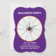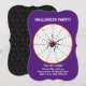 Invitation Halloween araignée veuve noire sur fond violet royal. Tous les textes et numéros sont prêts à être personnalisés.