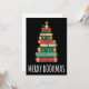Sapin de Noël amusant formé par des livres, avec des ornements de Noël et une étoile de Noël, et la citation "Joyeux Bookmas". Une façon cool et drôle de célébrer la veille de Noël.