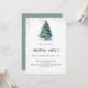 Invitations hivernales pour une fête de Noël. Un arrière - plan blanc à l'avant décoré d'un pin dessiné à la main couleur de l'eau avec de la neige et une parties scintillant étincelante. Personnalisez et ajoutez les détails de votre fête. Retour : arrière - plan bleu-vert.