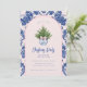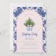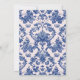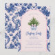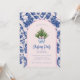 Cette invitation de Noël a un design primitif et millénaire avec un sapin de Noël dans une crête de pot en Chinoiserie bleue et blanche avec une bordure en arcade bleue et rose vif autour du bord. L'avant et l'arrière ont un motif de damas de coordination.
